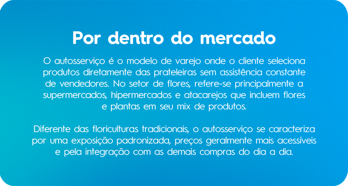 Segundo dados do estudo de Mapeamento e Quantificação realizado pelo Ibraflor (Instituto Brasileiro de Floricultura), o autosserviço já representa 9% do faturamento do varejo de flores e plantas ornamentais no Brasil, movimentando aproximadamente R$ 385 milhões anualmente.